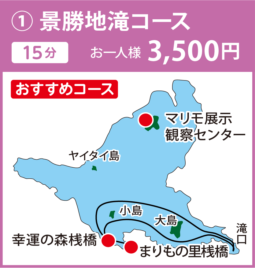大島コース(10分)からチュウルイ島・景勝地滝口を巡るデラックスコース(45分)まで、6つのコースを設定。阿寒湖の旅の思い出を演出します。