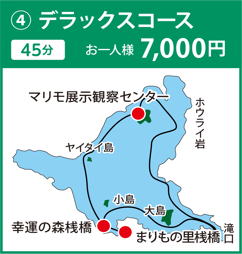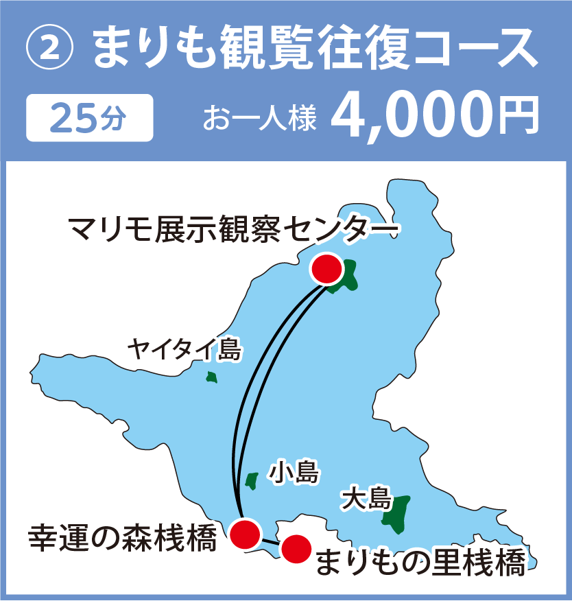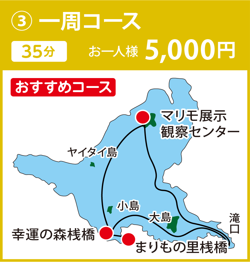 大島コース(10分)からチュウルイ島・景勝地滝口を巡るデラックスコース(45分)まで、6つのコースを設定。阿寒湖の旅の思い出を演出します。